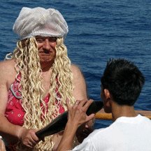 Returning to the ship for breakfast, we soon heard that we had to assemble on the sun deck for clearance procedures before we could cross into the Northern Hemisphere. Once there we greeted King Neptune and his Queen, the ravishing Tethys, mother of all the oceans. Those among us who had not yet crossed the line by ship (called “polliwogs”) had to be cleansed. This involved the ceremony of kissing a fish, a haircut, consuming an inoculation potion and a dip in the pool. Once all these polliwogs had become “shellbacks” and King Neptune had given his permission, we proceeded up to the line itself.