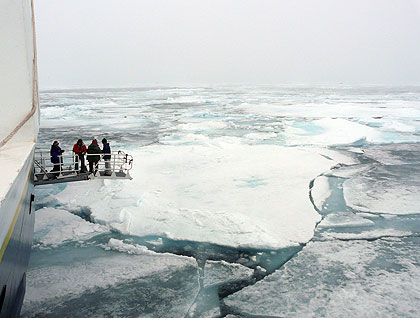 You can count on Lindblad Expeditions and the National Geographic Explorer to find a new way to experience our passage through the ice. The port side hydraulic door and platform were deployed so we could step out to watch the ice pass directly below us.