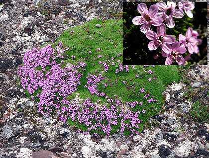 In the Arctic, all plant life derives from the shallow, seasonally thawing “active layer” atop the frigid permafrost below, yet tundra plants flower profusely in the short summer season. We walked over tundra vegetation rich in saxifrage species, and carefully stepped around mats of mountain avens, members of the rose family, adorned with flowers of ivory and yellow. We saw the small purple flowers of the moss campion concentrated on the warmer south-facing side of the mat, thus serving as an “arctic compass.”