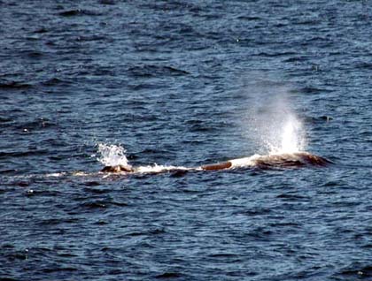 We had a number of sightings from the bow of marine mammals and seabirds, including several beaked whales. These enigmatic mammals are usually only seen once and typically at a considerable distance. Once they dive, they are not seen again, so very little is known about them and much of that information has come from strandings of dead animals on shore. However, shortly after lunch today, we had a very nice sighting of a sperm whale. Our expert observer Richard White spotted the animal logging at the surface and Captain Kruess maneuvered National Geographic Explorer slowly toward the whale so that all of us on the bow and on the bridge could get close looks and excellent photographs.