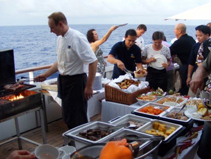 We continued with our lecture program with David Barnes talking about the life of Charles Darwin, who traveled this exact same route aboard HMS Beagle some 170 years ago. Jim Kelley explained how surface currents and winds work about the globe, something of great importance to our predecessors who relied upon winds to get about the world’s oceans. Kate McKeehen, our talented professional artist, operated another workshop to help the budding artists on board. Howard Zeiderman, of the Aspen Institute, oversaw some spirited discussions about our seminar readings concerning early interactions between Europeans, Africans, and Amerindians. Dinner was a fun-filled barbecue set up outside on the Aft Deck (see Photo A), complete with all the trimmings, including fresh tuna purchased yesterday at Fogo Island and a sushi bar (see Photo B)! Kim Heacox finished up the day with an impressive show of his incredible photographs taken during this voyage (he must have a really good camera), and he gave us more insights into how the rest of us can produce better photographs.
