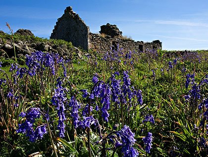 We walked the half-mile to the archaeological site along the coast path. Great black back gulls and terms careened overhead, not pleased with our presence in their private kingdom. As we walked the main path to the monastery we passed the empty homes of all those who lived for centuries on this island; the names Brady and Gillespie are visible in the graveyard. Inishmurray had a permanent population until the mid-1950’s when the people petitioned the government to help them leave the island for a better life on the mainland in Sligo. One of the homes still had the remnant of a curtain being beaten by the wind, and I imagined the family saying goodbye to their home. Not an easy thing to do. Bluebells scattered color across the landscape, adding a poignant counterpoint to the ghostly solitude of the abandoned homes.
