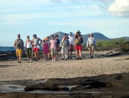 Next we had a wet landing on a striking, black sand beach for snorkeling. Soon after we set out for a walk, which brought us to a close encounter with fur seals resting by the grottoes. There were so many highlights: Sally Lightfoot crabs, sea birds, the impressive landscape. But just when you thought you have seen it all, there it was – a recently born sea lion; this particular baby was so frail it couldn’t master its balance. Mother nature's force of gravity pulled him downward into a foot deep hole, and we all felt that fall in unison. You could see by the expressions on our guests' faces that it was as if the newborn were their own child. We were immediately attached to this wonderful little creature. Mommy reaches, and like a canine, she grabs her baby by the neck and brings it out of the hole and close to her; her little sea lion learned his lesson and he now spreads his four limbs for stability.