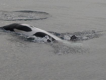 As I expected, everyone showed up on deck, some already drinking their coffees, some still in their pajamas. As a result, we all got the incredible experience of witnessing what looked like four adults orcas teaching a baby orca how to get its meal. Part of the teaching involved everything that we tell our human kids NOT to do: first, play with your food as long as you want and second, just eat what you want and leave the rest!