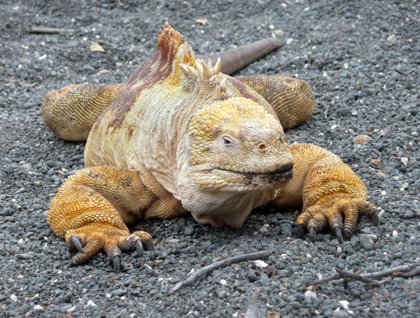 The Captain hauled up the hook at 0500 this morning and we navigated across the Bolivar Channel to drop our anchor at the base of Volcan Alcedo. This is an interesting area geologically since several miles of the coast line were uplifted by 4-5 meters in 1954. There are huge coral heads well inland along the trails. We had long and short hiking options this morning and we found at least a dozen large colorful land iguanas along both trails. It is mating season for these impressive reptiles and many of the males were head bobbing and defending their territories. Fausto spied an octopus hiding among the rocks at a quiet little beach, and four tawny juvenile hawks flew down to inspect us at the landing beach. Guests swam with feeding penguins and a cormorant, and some of the kids dug in the sand. We were reluctant to leave this tiny, pristine and peaceful beach but did not want to either miss lunch today or have to spend a week on shore waiting for the National Geographic Islander to return here next voyage… So, we unenthusiastically boarded the Zodiacs and headed back to the ship.