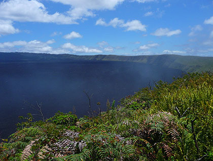 But the time passed by and the dolphins left us, and our attention moved forward to what we were expecting already, climbing Sierra Negra volcano. The weather wasn’t promising and from the beach we couldn’t even imagine the shape of this volcano, the southeastern most of all of the volcanos of Isabela Island. But providence accompanied us during our expedition, and even though we had the constant presence of the garúa (misty rain) the morning was clear enough for us to see inside of the caldera; to see the entire caldera. A vermillion flycatcher escorted us for awhile during a pleasant stroll along the rim of Sierra Negra.