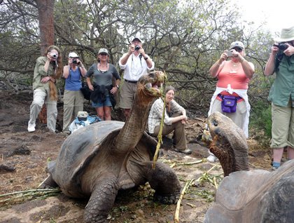 We all disembarked in raincoats this morning. On the Zodiac the garua soaked our clothes and our caps were soon covered by our jacket’s hood. Rain is worth being mentioned in the Galápagos, it’s a scarce and short last event. The sun soon had everyone peeling off their raincoats as we continued to make our way to the Giant Tortoise Breeding Center and the weather changed to hot and humid. Finches were on their post rain duties and tortoises, awakened by the mist, became active.