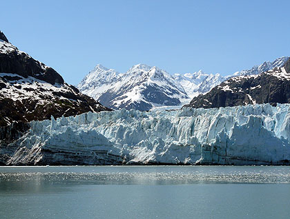 We left Park Headquarters at Bartlett Cove early in the morning in brilliant, clear weather. Mount Fairweather, at 15,300 feet, was visible, and so it remained all day. The Fairweather Range is, in a sense, the Mother of Glacier Bay. The tall mountains trap moisture coming from the Pacific; it falls as snow, accumulates as ice, and fuels the glaciers of Glacier Bay.