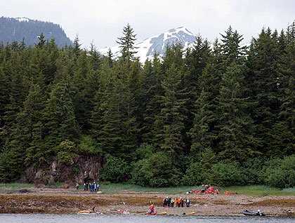 Long hikers took off first as their goal was to bushwhack along the lakeshore as far as they could get in 3 hours. Others of us took to kayaks for some time on the water, exploring the bay and the tidal river mouth that leads inland to Pavlof Lake. While afloat, we saw eagles flying overhead, screaming their haunting calls or perched in trees lining the bay, their white heads like giant golf balls awaiting Paul Bunyan’s tee time.