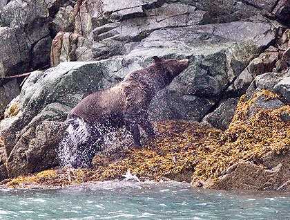 The Margerie and Grand Pacific Glaciers, both terminate in Tarr Inlet, where we woke up to a brown bear foraging at low tide. Brown bears use their paws and claws to turn rocks and find breakfast in the inter-tidal zone. Binoculars put you with the bear along the shore, and you can almost hear their paws crunch on the rocks and seaweed.