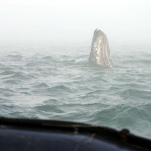 This first day of spring was different than any most of us had spent before. And, every part of the day was different than the others . Those of us who are early risers (or who decided to masquerade as early risers for the day) enjoyed the clear, moonlit morning skies as we rose before dawn. By sunrise, all had changed. The fog had joined the scene. We did not let that stop us. Off we went in our flotilla of Zodiacs to search for gray whales in a world of gray water and gray sky. Although at first it seemed like a needle in a haystack search, we were well rewarded for our efforts. It was hard to say who saw who first, we humans bobbing and pointing from our boats or the whales spyhopping out of the mist for, perhaps, a look around.