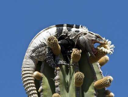 These rather large iguanas are complete herbivores that have developed an amazing ability to climb the tallest living thing in their world; cardon cactus. Leaving the relative safety of the ground, several spiny-tailed iguanas delighted our photographers this morning by climbing cardon cactus in order to feed on the flowers at the very top, at times over 30 feet from the ground. To see (and photograph) this amazing arboreal iguana navigate the spines of the cactus and climb to dizzying heights in order to find food delighted us all, and made for a great photo as well!