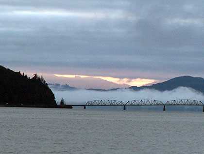 The swells rolling in from the Pacific Ocean drew us out to the bow to find that, wow, we are pretty far out to sea… Off on our starboard side, Cape Disappointment light was flashing, and behind us to the east, the first light of dawn was throwing pink at the clouds of this beautiful fall day at the coast.