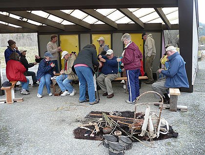 After a lunch of soup, salads, and sandwiches in Kamiah (“rope litter”), we made some of our own rope litter and cordage from Indian hemp and cattail leaves and learned, from survivalist Lee Hamilton, how to make fire with flint and steel as well as wood friction. Lin told us the Nez Perce creation story at the Heart of the Monster, one of 38 units of the Nez Perce National Historic Site. It rained briefly as we visited Canoe Camp, where the expedition build five ponderosa pine dugouts for their journey down the Clearwater, Snake, and Columbia rivers to the Pacific.