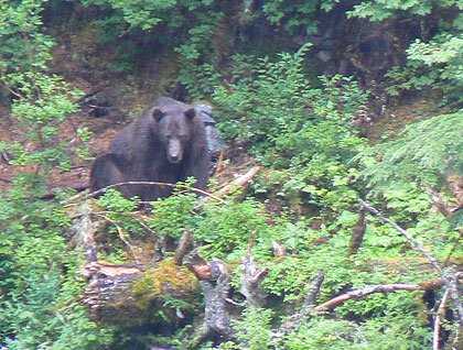 This bear proved to be very tolerant, so we were able to follow it at close range as it meandered along the water’s edge. Eventually it found its way to a broad tidal flat, where we saw a forth bear. “Our” bear, though small, was either hungry or tough, because it chased off its larger neighbor, then spent some time looking for fish to catch or scavenge. After plenty of “quality time” with these bears, we motored on, and eventually found a fifth bear near the south end of Chichagof.