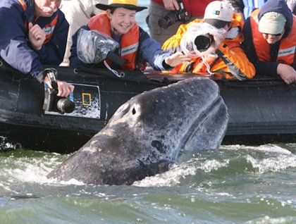 After spending the night anchored in the calm waters of Bahia Magdalena, we had our first opportunity to hop into our Zodiacs and take a closer look at the magnificent grey whales. As we navigated south, where our local guides had advised us to go, we spotted a blow, and then another smaller blow close to it. A mother and calf pair was slowly moving north towards Boca de Soledad. We moved alongside the whales, keeping our distance, and suddenly their behavior changed and they headed right to our boat! Having an encounter with a friendly whale is so hard to describe that it has to be experienced to understand the emotion it creates. Well, today some of us got to know that feeling. Every round of whale watching was exciting and we felt as if the whales were having as much fun as we were, they kept following us as if they did not want the game to end.