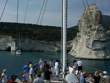 When everybody was back on board, lunch was served and soon after we sailed towards Milos. We sailed very close to the southern coast of the island and we had the opportunity to admire all the different colors of the rocks that their volcanic origin offers. We stopped at a very interesting sculpted volcanic beach called Kleftiko. The captain took us really close, allowing us to take many pictures. The cliffs were white and had many caves. It was like a movie set. Soon after this it was time for our “Greek lesson”. Everybody had the opportunity to learn the Greek alphabet and try to read their first Greek words. And everyone did really well!