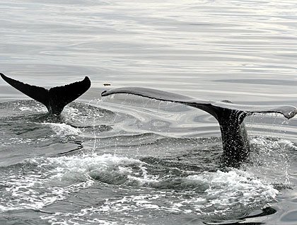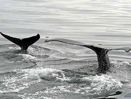 By late afternoon the water’s surface was glass-like. Just inside Frederick Sound a solitary humpback whale made several dives. Less than a mile away were two other humpbacks – a mother and calf. As the mother dove, her tail flukes lifted gracefully out of the water . . . while the tail of her slightly clumsy young calf barely broke the surface. One time they surfaced very close to the ship. After swimming alongside the ship for a couple of minutes, both mother and calf gracefully raised their tail flukes in front of the bow before slipping under the surface for a dive. Pure beauty and grace!