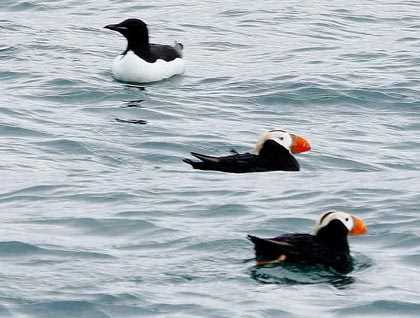 Just after breakfast, we stopped at South Marble Island, composed of 400 million year old Willoughby Limestone, part of the Alexander Terrain. Here we observed Steller sea lions taking advantage of the smooth rounded rocks for a haul-out, while a myriad of birds perched, floating or flying, all ready to partake in a meal of plankton or fish in the nearby waters.