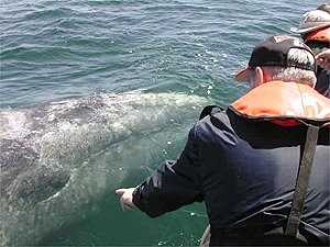 Should it be surprising that a wild animal should seek us out for an encounter? I think so. It would be like any potential prey animal seeking out a predator to play with. Curious animals should be selected out of a population over time, unless there is some advantage to being bold and curious. Some reward should be gained for taking a chance with the unknown. How does this grey whale calf know that one of our Lindblad Expedition guests isn't going to stick his finger into its eye like may happen in this photo? Possibly the reward is a chance for mere pleasure. Most of us are willing to take that chance. Perhaps this calf and its mom know from experience that if they stay around, we'll excitedly squeal and giggle. They are trusting and gentle, with a desire to reach out and cross a species barrier and enter an odd and foreign world. They, in turn, deliver us into their world, and that is what makes the experience so very special.