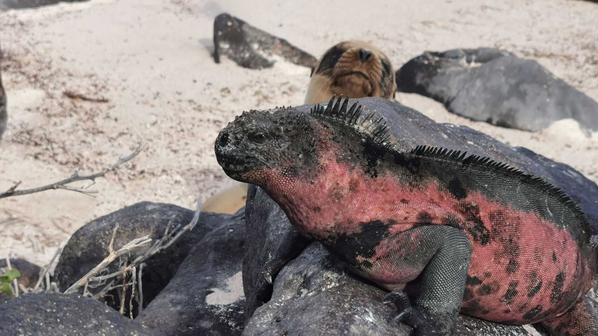 Photo caption and credit: A colorful Galapagos marine iguana warms up under the sun with a sea lion in the background. Photo by Gilda Gonzalez