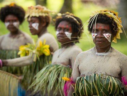Our first morning in Papua New Guinea found us entering the flooded remains of an ancient caldera. Our anchorage was surrounded by Garove Island, steep and sheathed in a lush coat of greenery. Outrigger canoes paddled out to greet us, decorated with palm fronds for our visit, leading us ashore to the first rhythms of the “sing sing” we were about to enjoy.