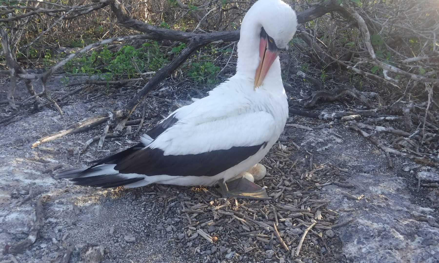 The white coralline beach and the red mangroves are in this island the nesting place for red-footed boobies. Minor frigatebirds that have already mated are now sharing cores of incubation and the raising of the chicks. A few bachelors are displaying their half-inflated pouches to females that don’t seem to be particularly interested in them yet. They will have to practice and fully inflate them in order to be taken seriously.