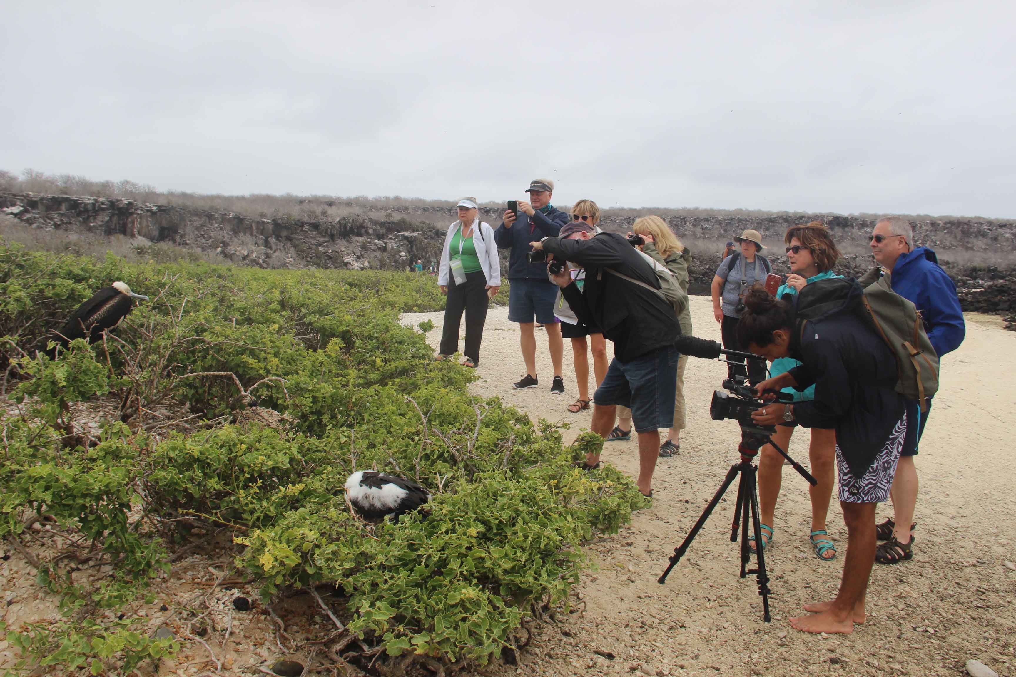 It was a very relaxing and entertaining walk on the sandy area, surrounded by nesting red-footed boobies, frigatebirds and gulls. Frigatebirds in the air impressed the group every time they chased a red-footed booby or a tropical bird to steal their fish, with a full display of their expert flying skills.
