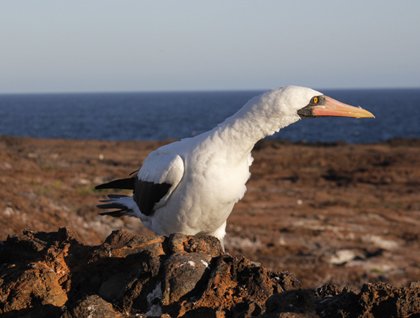 Today we started our day anchored in the middle of an extinct volcano. This old volcano rises out of the ocean, creating an incredible isolated habitat for several species of birds. This island holds the name of Genovesa. In the morning we landed on a white sandy beach to explore the extensive nesting grounds of the red-footed boobies. Several boobies were nesting on the red mangroves. Nearby some large cactus finches were eating the nectar of the yellow flowers of the Opuntia cacti. We spotted a few white red-footed boobies nesting and roosting on the greenery of the coralline area. Along the basaltic cliffs, in the shade, a few yellow-crowned night herons sought shelter from the equatorial heat.