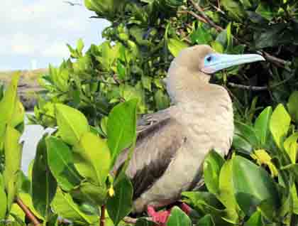 Our day started early in the morning by visiting two separated landing sites, one at Prince Philip’s Steps and the other at Darwin Bay. I disembarked on the white coralline beach of Darwin Bay, formed at the far end of the caldera and surrounded by red mangroves trees. A great highlight during the visit was our first encounter with the colorful red-footed boobies, who are just as enchanting as their blue-footed cousins. We found many of them nesting and perching in trees, while on the beach was a delightful small sea lion colony. Walking along the shoreline, we observed male frigate birds with their red sacks inflated, producing unmistakable noises to call the attention of females which flied around of them choosing the best to couple with during this mating season.