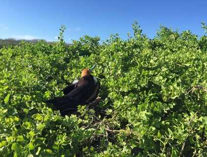 The other groups hiked along a small coralline sand beach, where a slightly different array of wildlife can be seen. Red-footed boobies nesting in mangroves along the coast line, others on low bushes, frigatebirds in their breeding season, inflating their huge red pouches to attract the females that fly around in search of potential mates. Sea gulls were everywhere—this variety is so beautiful, and they differ from others in that they hunt at night, preying mostly on squid and flying fish.