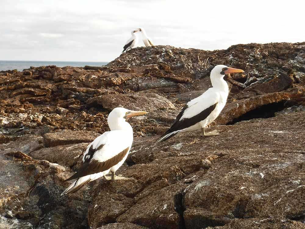 This island is made of basalt and it is flat and rocky nearly all around. It is dry at this time of the year and it will continue to be for months to come. Red-footed boobies and frigate birds nest in the trees and swallow tailed gulls, Nazca boobies, and storm petrels nest on the ground forming vast colonies on the bare lava and under the dry forest. Either in the early morning or late afternoon we can appreciate the best of Genovesa. The different sea birds go into the ocean and come back to the colony with food. We can see parents feeding their chicks, and the whole island vibrates with bird sounds!