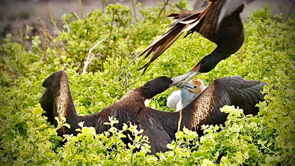 Tower Island, or Genovesa, is home to over one million seabirds. This included frigatebirds displaying “kleptoparasitic” behavior. As an adult female regurgitated food to feed her baby, a frigatebird thief dove down and succeeded in taking part of the food. The sight, sounds, and speed of this antisocial behavior right in form of our eyes was outstanding. We also spotted a few marine iguanas that are smaller and darker than the ones at the southern hemisphere islands. Each island has its own ecology and like Petri dishes, they yield different results.