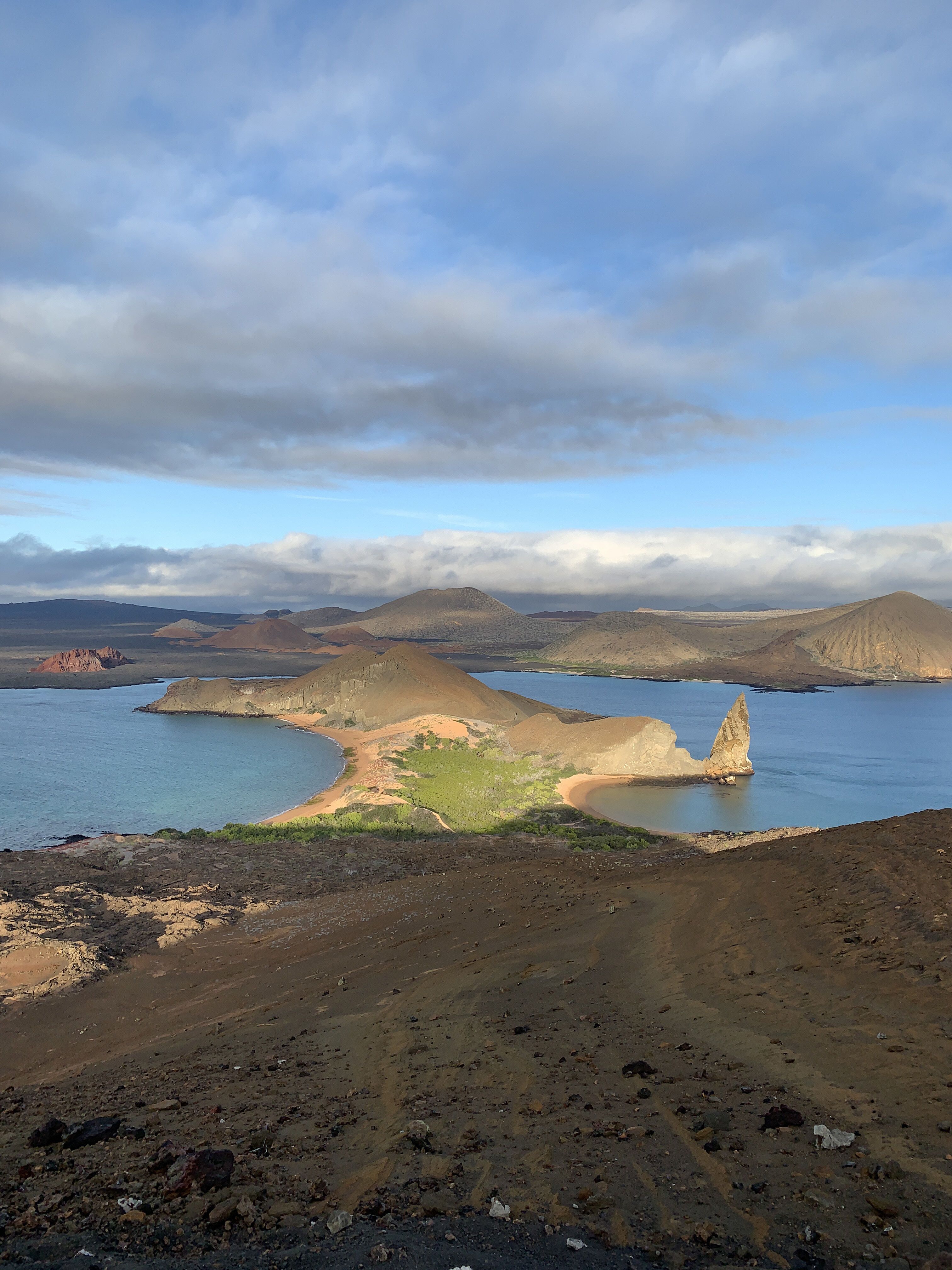 On National Geographic Endeavour II today, we explored Bartolome, home of a small colony of Galapagos penguins. Bartolome is one of the youngest islands, and it is located next to Santiago Island in the central part of the archipelago. After an amazing sunrise, we went ashore for a walk, and we were transported back to a time when the land was newly formed. We began our day by hiking to the top of a tuff cone known as the islet of Bartolome, named after the First Officer of The Beagle . Walking on this young island allowed us to understand the formation and volcanism of the Galapagos Islands. The rocks are a great way to understand the area and its geology. We spotted a few lava lizards and painted locusts, some of the very few animals on this island. As we reached the top, we had a great view. Our guests enjoyed the magnificence of Pinnacle Rock. After we visited one of the most iconic geological formations of the Galapagos, our breakfast was enhanced by dramatic views of the impressive volcanic landscape. We visited the beach near Pinnacle Rock, where we enjoyed how the sun made the sand sparkle due to a concentration of silica. Later, we went snorkeling along the channel between Santiago and Bartolome Islands. Many of our guests spotted whitetip reef sharks and very colorful parrotfish. The landscape was beautiful with lots of sea stars. We enjoyed the chance to be surrounded by Galapagos penguins and feel accepted as part of this environment. After a delicious Mexican lunch, we had lectures on the photography of reptiles and Darwin. Afterwards, we went to Chinese Hat Islet to snorkel from the Zodiacs. The area is home to a small colony of Galapagos penguins. In a sandy-bottomed, sheltered channel, our guests enjoyed swimming with whitetip reef sharks, rays, and many fish. It was a nice and sunny afternoon. After snorkeling, we had the chance to explore the unique, small volcano that formed an island in front of Santiago on a sunset Zodiac ride. After a spectacular day full of activities in the field, we returned on board. Every day in the Galapagos is an opportunity to reconnect with the beauty of nature through unbelievable encounters!