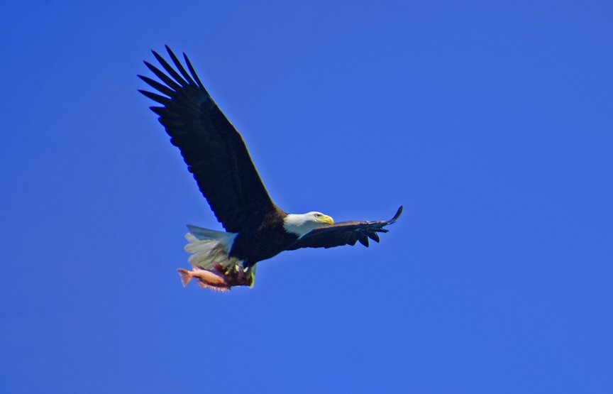 After a short cruise to the Inian Islands, we dropped anchor and headed out for an afternoon of exploration by expedition landing craft. Wow! It was a truly amazing experience. We came into an area of dramatic currents and upwellings where the marine buffet line was open for sea lions, bald eagles, gulls, and other seabirds on an incoming tide. We hardly knew where to look as eagles plummeted to the water to catch fish, and then were chased by their comrades, occasionally dropping their catch and squabbling over ownership. Steller sea lions hauled fish from the depths, beating them against the water’s surface to break them into bite-sized chunks. Gulls dove in with gusto to clean up the scraps. The wind was fierce, but the brilliant sun and grand vistas kept smiles on our faces.