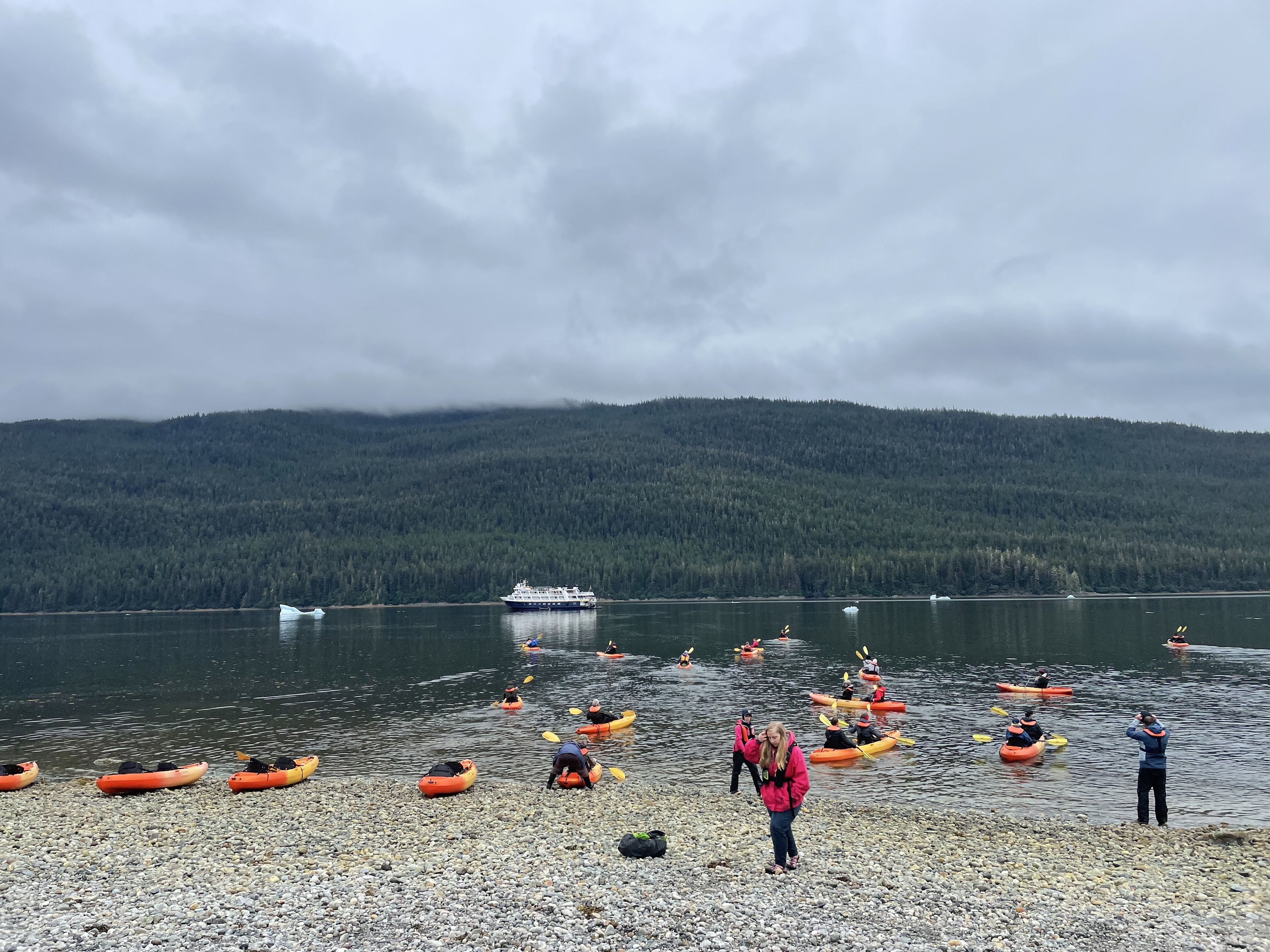 With sleepy eyes and coffee cups and hot beverages in hand, we began our day on National Geographic Quest in Glacier Bay with a delightful sighting of a brown bear. The bear meandered slowly along the shoreline, enjoying barnacles here and there as an early morning snack. Guests were able to observe the bear’s feeding behavior, and the rain did not put a damper a great start to the day!
