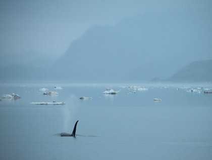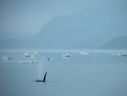 To wake up in a landscape dominated by glaciers and the chiseled fjords that are their progeny is a rare opportunity. For 65 miles, through the dead of night, we motored into the northernmost reaches of Glacier Bay National Park, affording us a chance to wake up near the terminus of one of the Alaska’s crowned jewels. The John’s Hopkins glacier, which spills hundreds of tons of solidified ice into its namesake inlet each week, was the first sight we took in. Under a low ceiling of clouds we glided west around Jaw Point when the only animal that could have whisked our attention from this fortress of solitude periscoped into view. Like a blackened blade, the six-foot-tall dorsal fin of a male killer whale sliced through the stillness, followed by its staccato breath and a legato retort from we unsuspecting spectators. For the next hour our determined captain slalomed his way through the ice, keeping pace with at least six Bigg’s killer whales on their way south in search, no doubt, for some unfortunate seals.