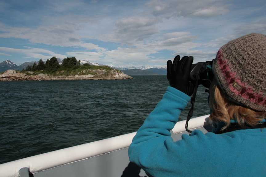 Life has returned in abundance to this fresh and wild landscape.  At South Marble Island, we watched Steller sea lions resting on low rocks.   Flocks of kittiwakes took flight whenever a bald eagle approached their cliff-side nesting colony.  Tufted puffins bobbed on the waves, easy to identify with their oversized, orange bills, and long, yellow crest feathers.   We found horned puffins, too.