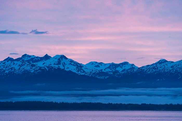 Dawn came very early today, at 4:30 AM, and in the form of a wide skein of rich pink cloud cover above the blues of mountains, water, and lower clouds. We were in transit to Bartlett Cove to meet our park rangers and cultural liaisons for a day at Glacier Bay National Park. Mamie Williams, our Tlingit guide for the day, boarded with a song as she walked toward the ship. She was soon followed by Molly Delandsheer, a park ranger, and we set sail for Glacier Bay.