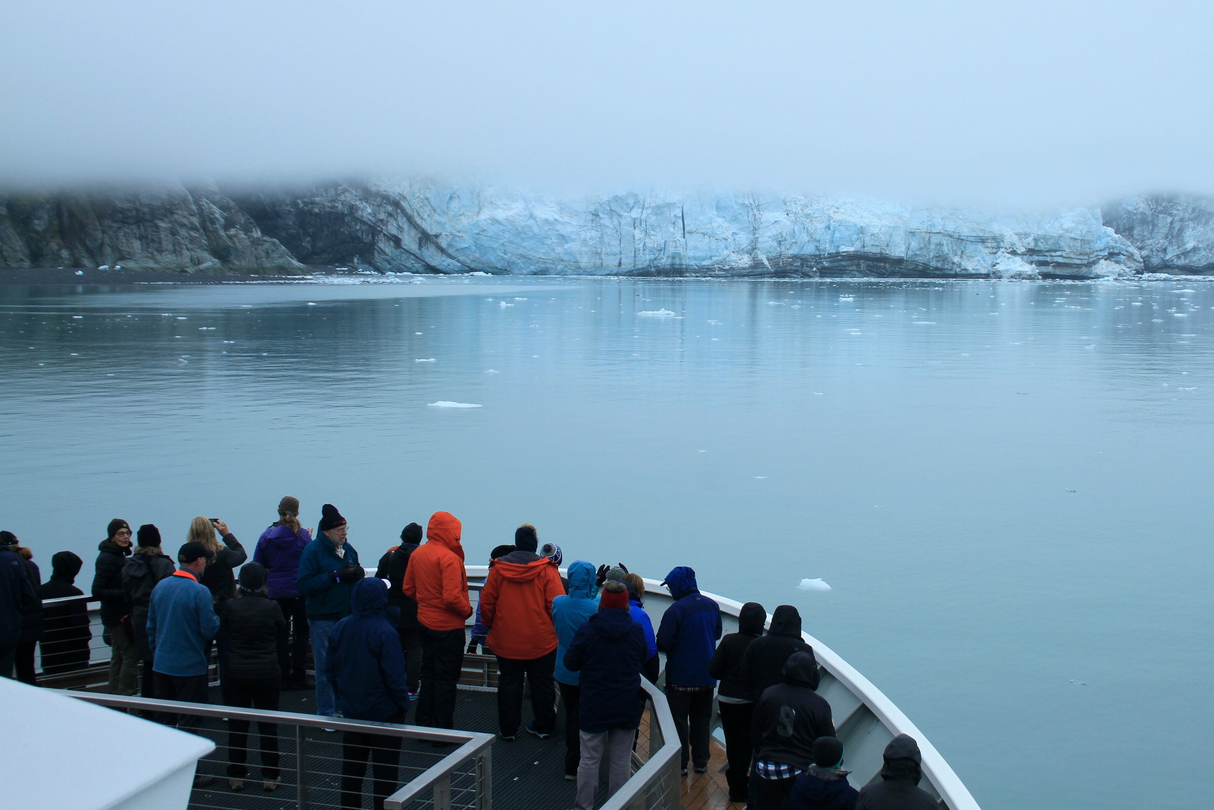 We woke up to today to sculptures of ice floating down the mirror-still water of a mist filled fjord as we proceeded towards Johns Hopkins Glacier. The air was crisp and still holding only a slight chill. The dramatic landscape unfolded in front of us, showcasing countless waterfalls spilling from the high walls of the fjord and complex structures of ice at the face of the glacier. Kittiwakes streamed by silently in the morning air as seals gave us a curious glance.