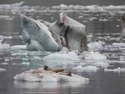 After leaving those two glaciers, we headed towards Russell Cut and later to the Johns Hopkins Inlet, where we spent a great time navigating around growlers, bergie-bits, and icebergs until we arrived in front of the Johns Hopkins glacier. We engaged in the same enjoyable activities that we did in the Margerie, plus another one: harbor seal watching! The Johns Hopkins Inlet is home to an abundant population of seals that rest and give birth to their pups on the floating ice in front of the glacier, where they are safe from land predators like bears or wolves. We observed many adult harbor seals and pups and took lots and lots of pictures.