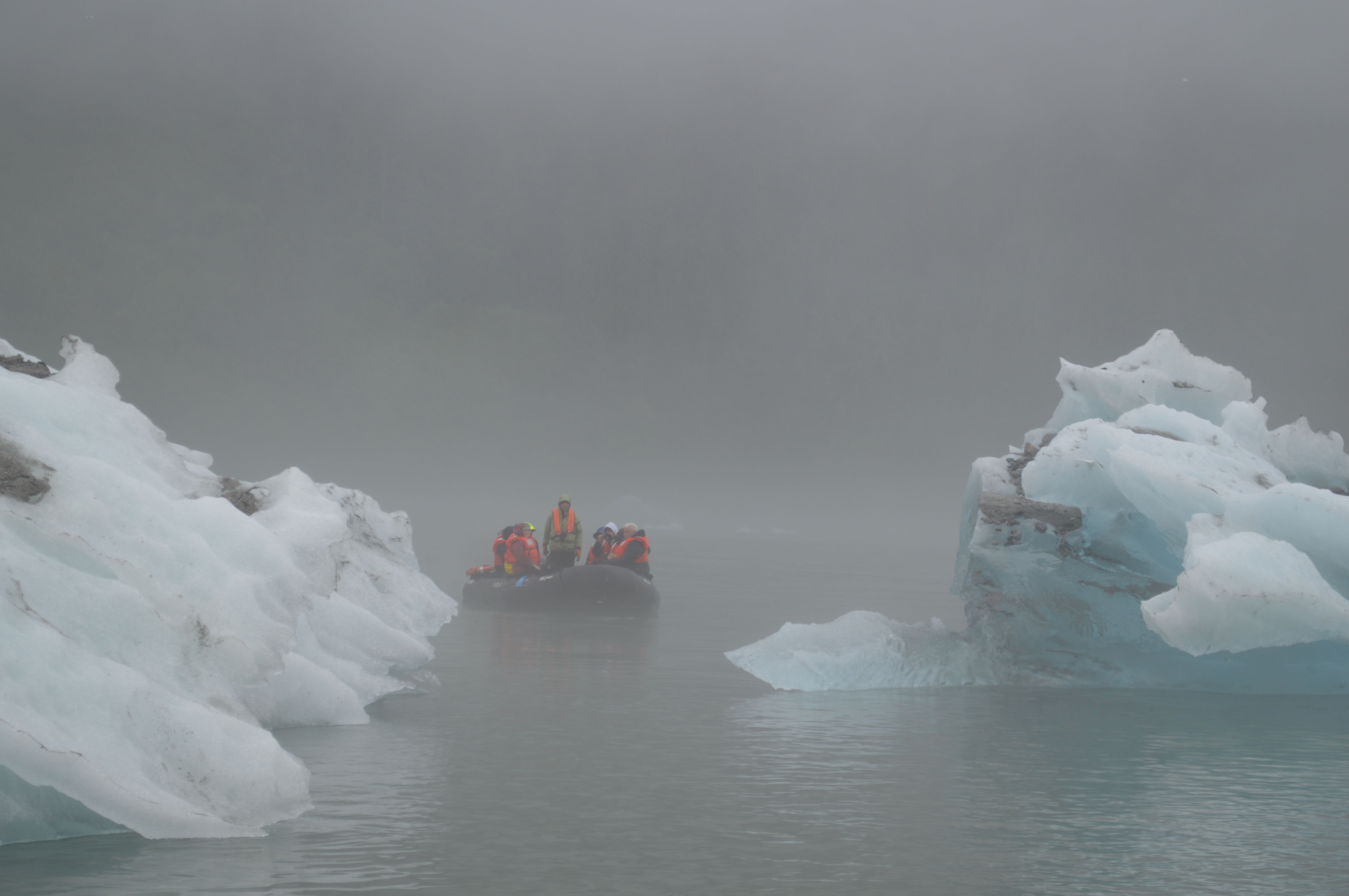 The second morning of our expedition found us in the glassy calm of Dundas Bay surrounded by fog-shrouded mountains. Sea otters, marbled murrelets, and a brown bear patrolling the intertidal were our welcoming committee. We explored this part of Glacier Bay National Park on foot and by tours in our expedition landing craft. In the afternoon, we visited nearby Idaho Inlet for kayaking, paddle boarding and walks near Fox Creek. Post dinner we marveled at a congregation of humpback whales in the middle of Icy Strait as the sun set over Glacier Bay.