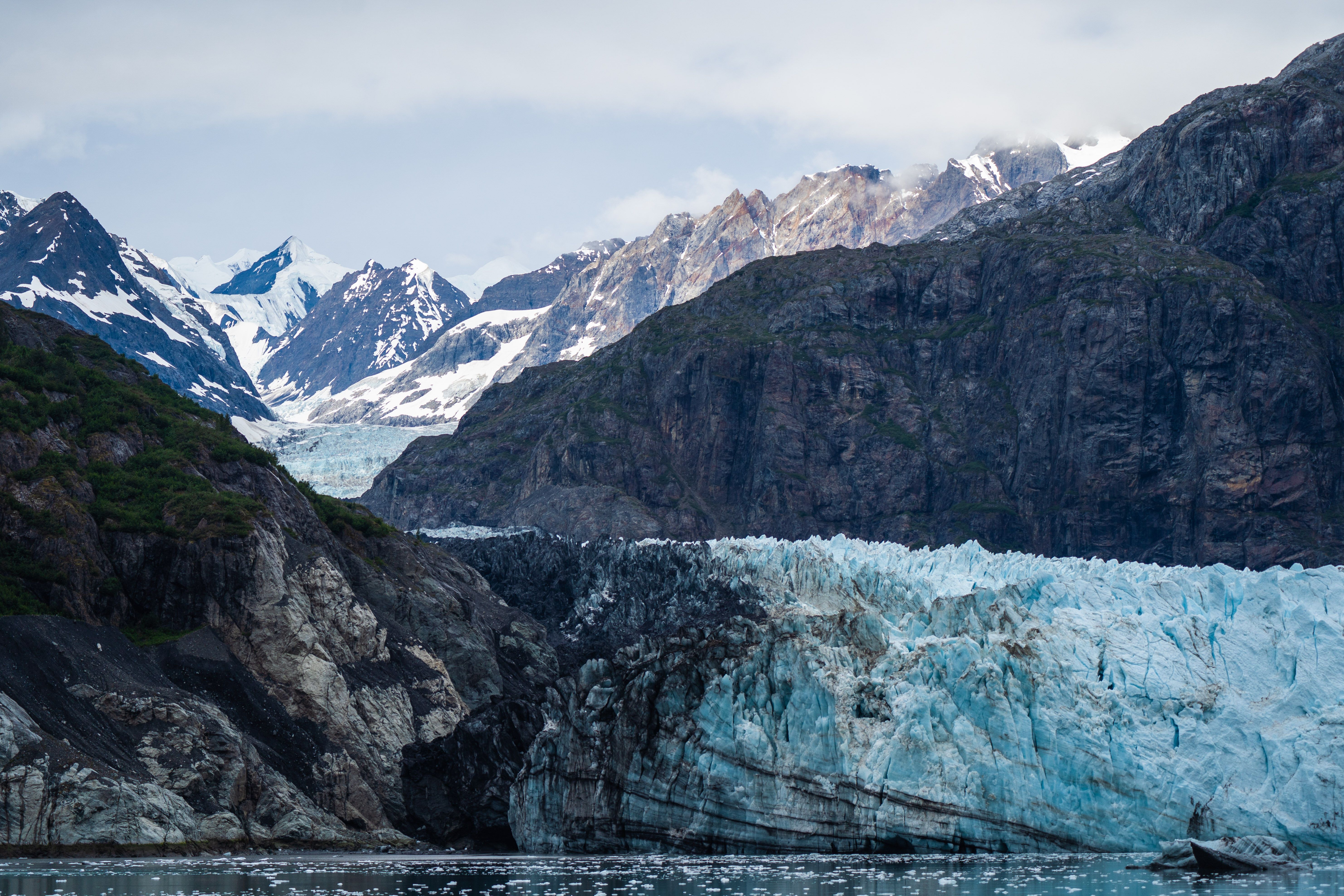 Photo caption and photographer: The Fairweather Mountains peek out through the clouds with Margerie Glacier in the foreground. Photo by Alex Krowiak