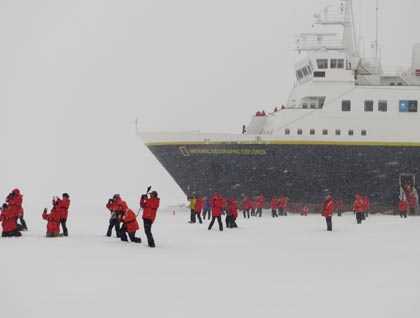 During the night National Geographic Explorer sailed slowly southward from the Lemaire Channel past the Argentine Islands and into the Grandidier Channel. Several inches of very fine snow fell, leaving a fresh blanket of white on our ship, the drifting pack ice through which we were pushing, and it even accumulated on the surface of the sea. Because the temperature of the sea water is slightly below freezing the new fallen snow did not melt but floated, giving the appearance of “grease ice” which is the term given to the very first stage in the formation of sea ice.