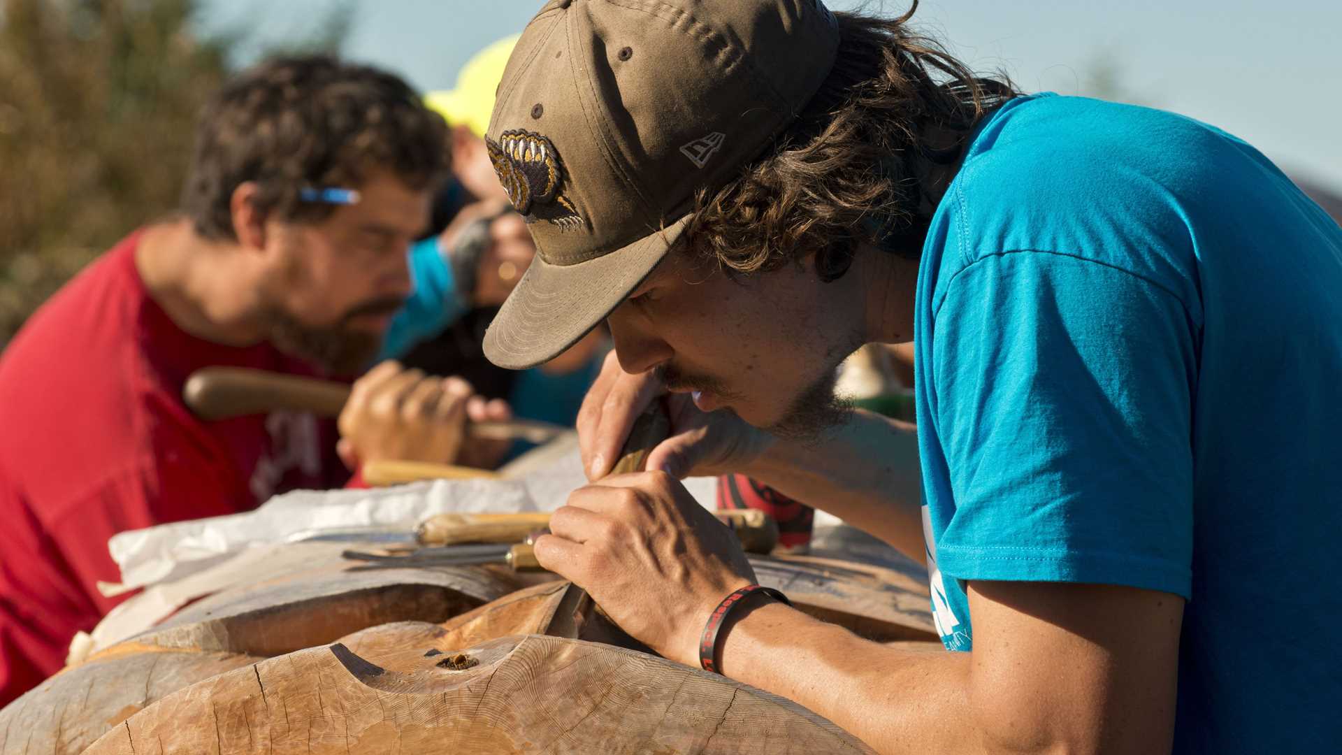 The windows of National Geographic Sea Lion were dark when many of us made our way up or down into the forward lounge. Dawn’s first light was just making its way over the eastern edge of a point called Sandspit. Pink clouds began reflecting on the calm seas, clear skies opened up above and slowly, sunrise began to decorate the harbor of Queen Charlotte City. Our plan for the day was a drive north along the entire length of Graham Island along the only road leading to one of the oldest village sites in Haida Gwaii the town of Old Massett. We boarded two busses and one van and began our journey north, arriving in the late morning. Once in Old Massett we divided into two groups according to bus colors and one group headed to the north end of town to James and Rosemary Hart’s house. Upon arrival we were greeted by Rosemary who invited us to come into the carving area, which consisted of a huge outside area just next to their house where an enormous and complex totem pole was nearing completion. At least six carvers were at work on this reconciliation pole which has been planned and worked on for over two years! James Hart a hereditary chief and master carver jumped up on one of many large blocks of wood and began a wonderfully detailed description of the work in process. Questions flew through the air along with wood chips and under warm and blue skies we were taken into the spell of a working village completely immersed in Haida culture. Each carver, each family member, each neighbor came forward to share conversation with us.