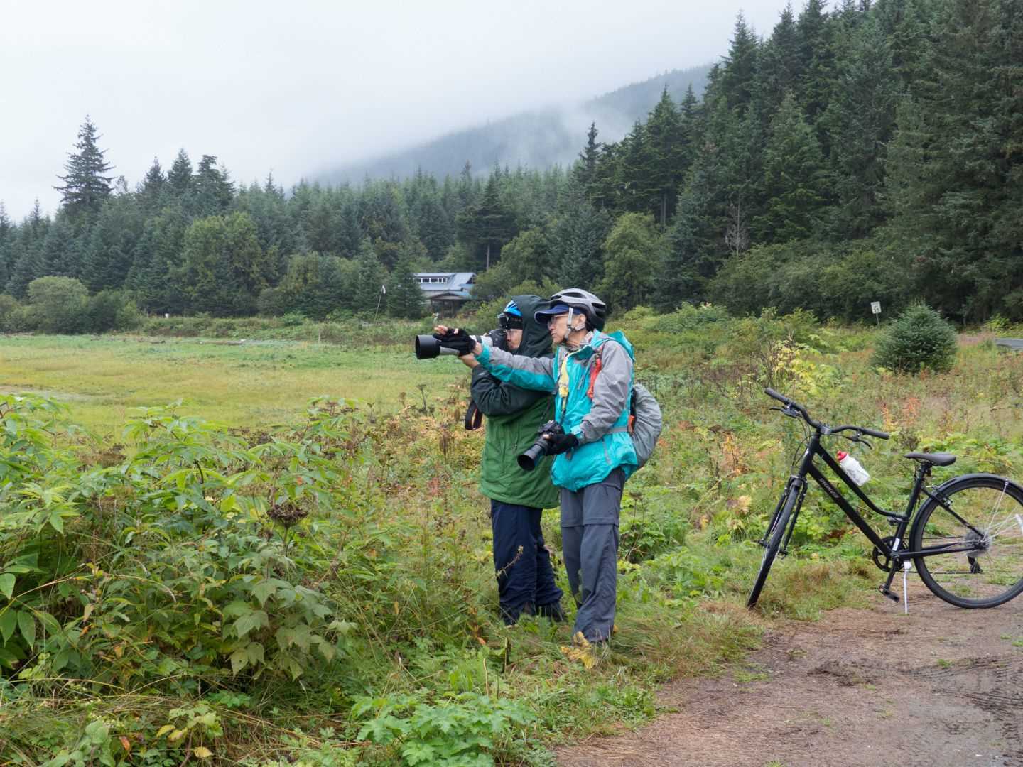 On the bicycle tour, we follow the shoreline, forest on our left and ocean to the right, spotting bald eagles, eagle nests, and diving sea ducks. Turning inland, we head upstream; now there is a river on our right, and it is full of salmon. When we stop to walk a short distance to streamside, we can see their backs breaking the surface. At the end of the road there is a big lake, and a forested path to meander along. All beautiful. But the real excitement comes on the ride back toward town: we spot a brown bear fishing in the river!
