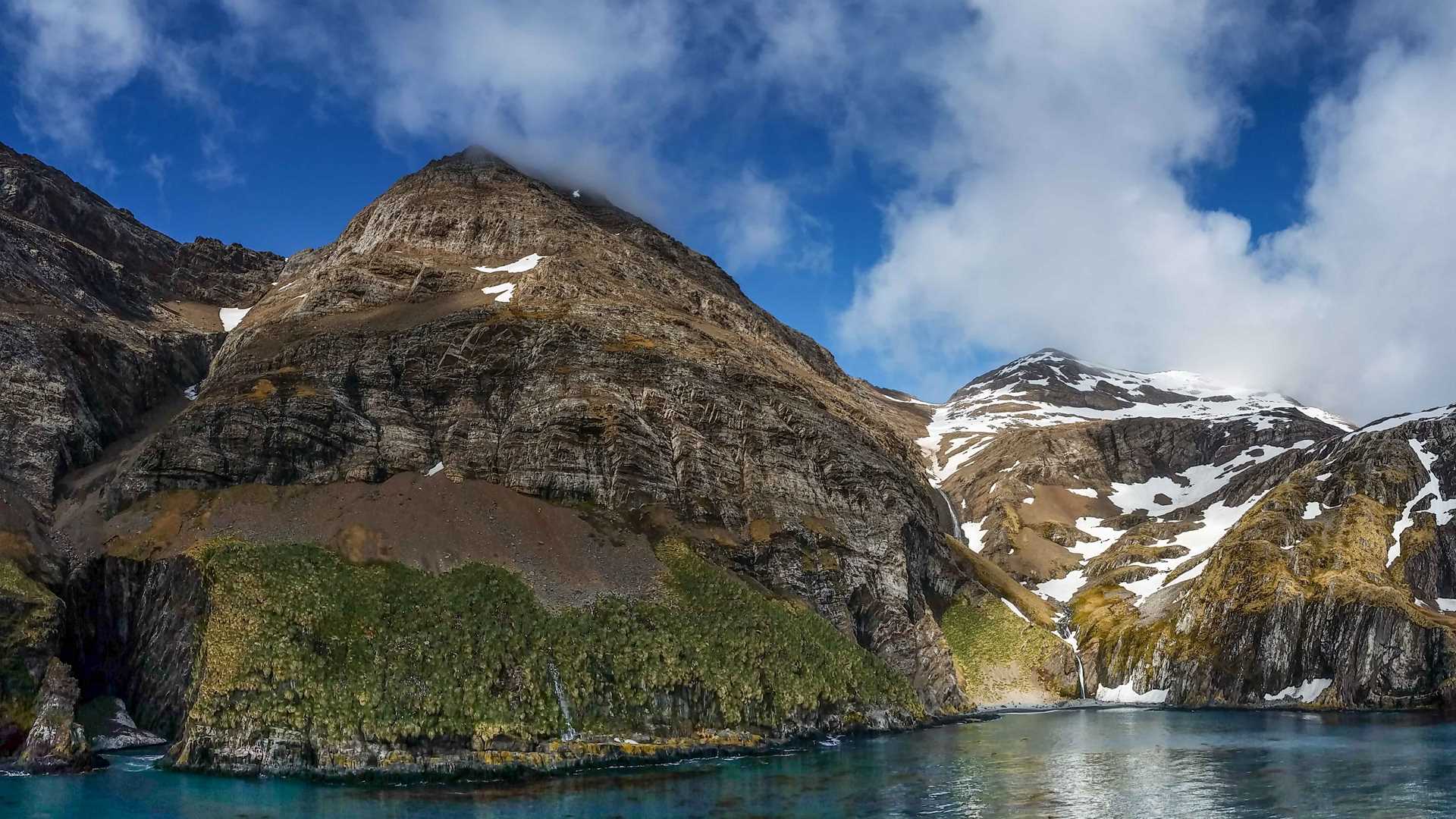 The mating calls and brays from thousands of macaroni penguins echoed throughout the steep walls of the cathedral-like Hercules Bay. The ethereal and haunting calls of courting light-mantled sooty albatross punctuated the air while they soared in tandem on their elegant wings. Elephant seals and Antarctic fur seals gathered on a small gravelly beach with a cascading waterfall pouring down behind, while their bellows, grunts, and groans added an extra layer to this soundscape. Add to all this a visual smorgasbord of brilliant blue skies and windswept clouds passing over the tops of the striking, striated peaks that make up this stunning bight in the coast of South Georgia. We spent the entire morning soaking in the sights, sounds, and even the scents from the water by Zodiac and kayak, making for an intimate and unforgettable experience.