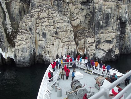 We spent the day in Hinlopen Strait, a long, narrow body of water that separates the two largest islands of the Svalbard archipelago, Spitsbergen and Nordaustlandet (Northeast Island). It runs on a northwest-southeast line, has a length of about 110 miles, and varies in width between six and 32 miles. The early morning found us near Kapp Fanshawe, located on the west side of Hinlopen Strait near Lomfjorden. The cape is marked by the high cliffs of Alkefjellet, which host one of the largest concentrations of nesting seabirds in Svalbard. At least 60,000 pairs of Brünnich’s guillemots nest on the vertical cliffs, along with a smattering of kittiwakes and glaucous gulls. The geological setting of the cape is unique and has been used in many textbooks to illustrate geological relationships. Gray, horizontal layers of sedimentary rocks that include shale and sandstone underlie the cliffs. These were deposited during the late Carboniferous Period, approximately 300 million years ago. The sedimentary layers were intruded by dark-colored magma approximately 140 million years ago during a phase of crustal extension. The captain and chief officer brought the bow of our ship right up near to the cliff face for a really close-up view of the rocks and nesting seabirds (Figure A).