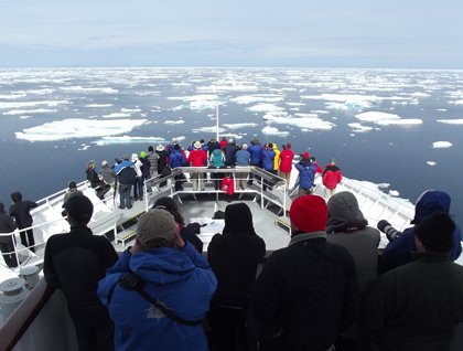 Before breakfast, we reached loose pack ice and an announcement was made informing everyone of walruses sighted on an ice floe. That was a great start in the morning, but before long we had our first polar bear of the day…then another…and another. Conditions could not have been better with partly cloudy skies, glass-smooth water with beautiful reflections, brilliant ice floes, and bears! Lots of bears. At one point in time, we could see nine bears scattered about, including a mother and cub, two swimming bears, and one on a seal kill. It would be hard to imagine the number of digital images produced this day. Every time we pulled away from a bear, we soon sighted another one doing something equally interesting. It was astounding to have two separate bears both approach the ship on ice floes one right after the other in mid-morning. Another one actually slid into the water off its floe and swam over to investigate the ship. Everyone found his or her favorite spot on the ship from which to sight and photograph bears…many were on the foredeck, some liked the outside vantage from in front of the chart room (just below the bridge), quite a few were in the bridge itself, and a bunch of us went for the higher view from the sundeck (right above the bridge).