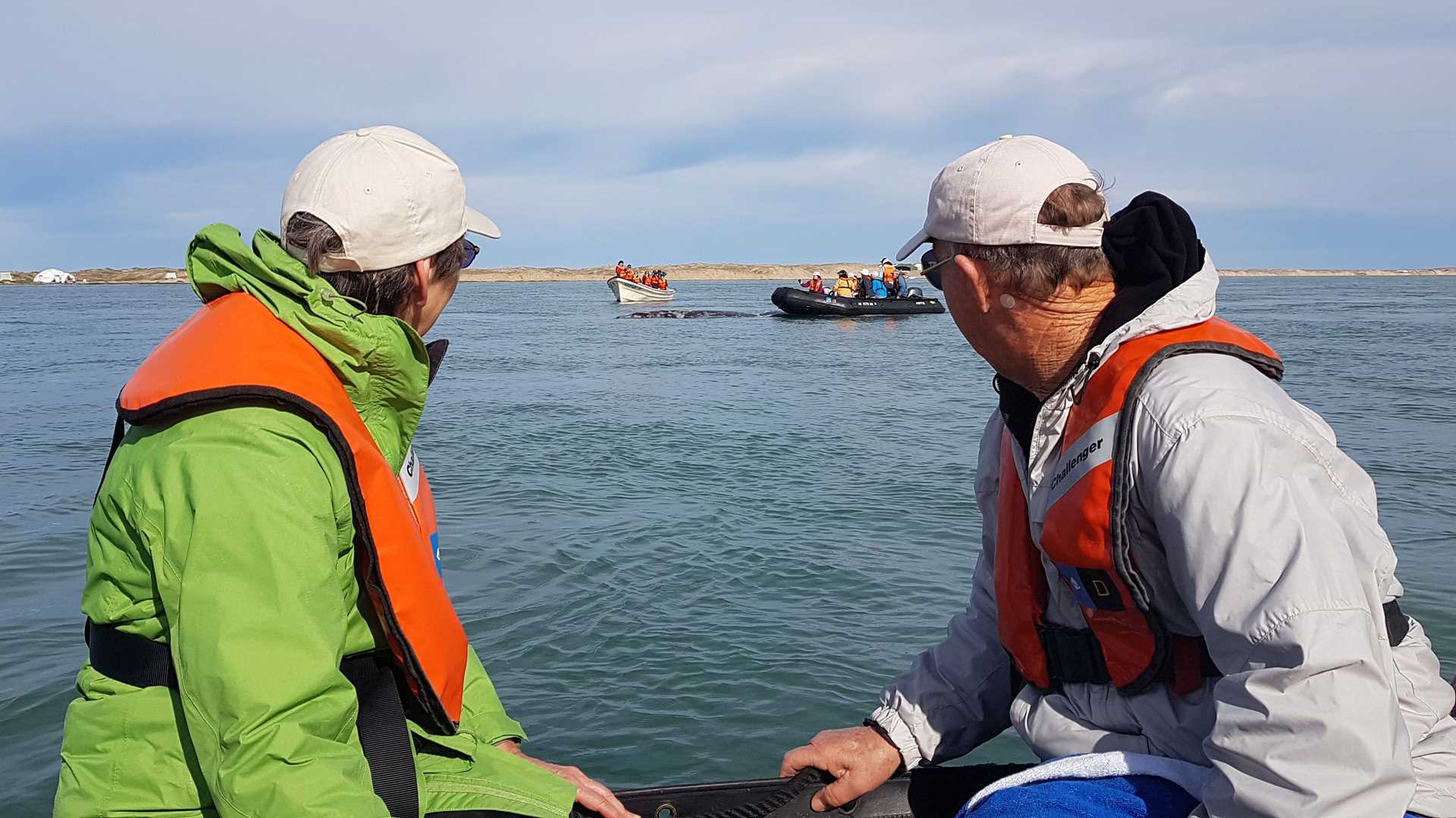 The roiling ocean, the relentless winds, the wet and cold of the previous day’s excursions—all was forgotten in the face of interacting with such awe-inspiring creatures. This is what drew us to the windswept Pacific dunes of a sparsely inhabited desert peninsula, plying the waters of a bay long used by an intelligent species that—for a few unforgettable minutes—is willing to share part of its life with us; a cross between two alien worlds. These experiences are what expeditions are made of.